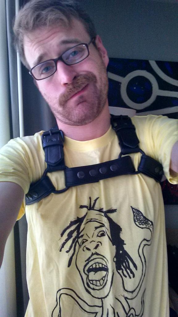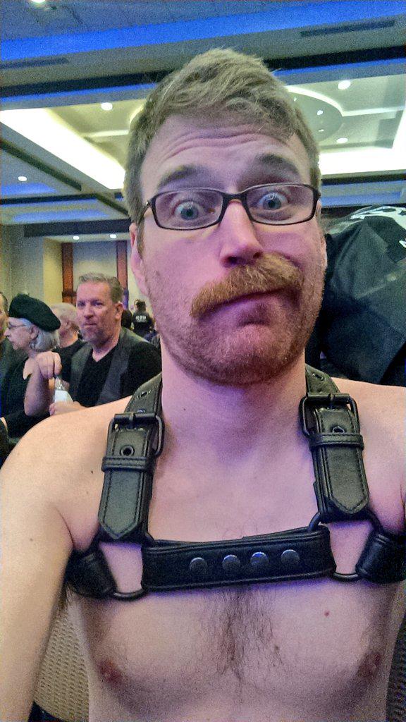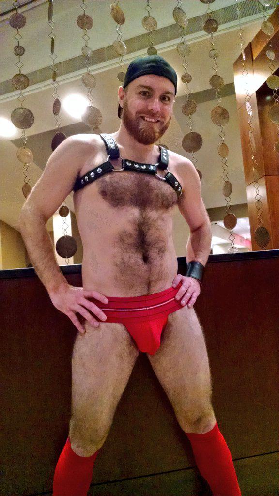 I am in love with the handsome, bearded, hairy short guy with the harness – but do not know who he is. ;-( He is extremely smokin’ hot!