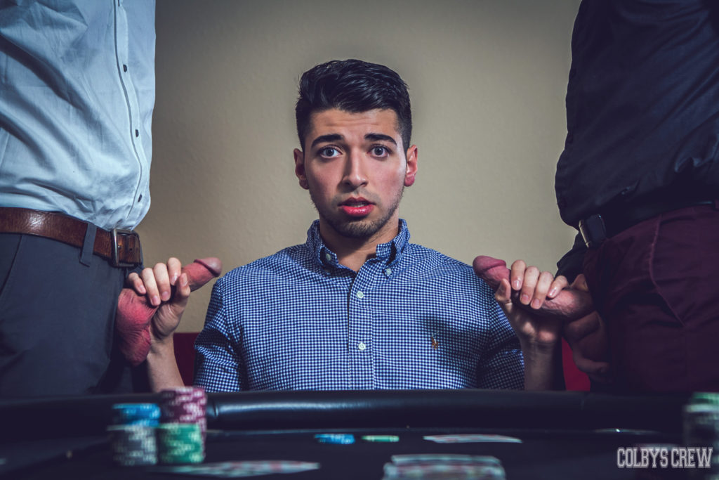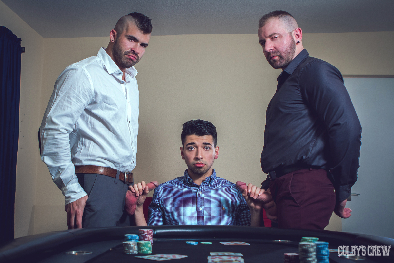 How much do I love that main pic? It reminds me of dogs playing poker except hot. In the latest Colby’s Crew scene, rough and ready Aleks Buldocek and Jonah Fontana make Brett Dylan pay his poker debt the hard way. On the table, on all fours, ass cheeks spread. I’d probably watch those stupid pro poker games they show on ESPN 23 if they all ended this way.
