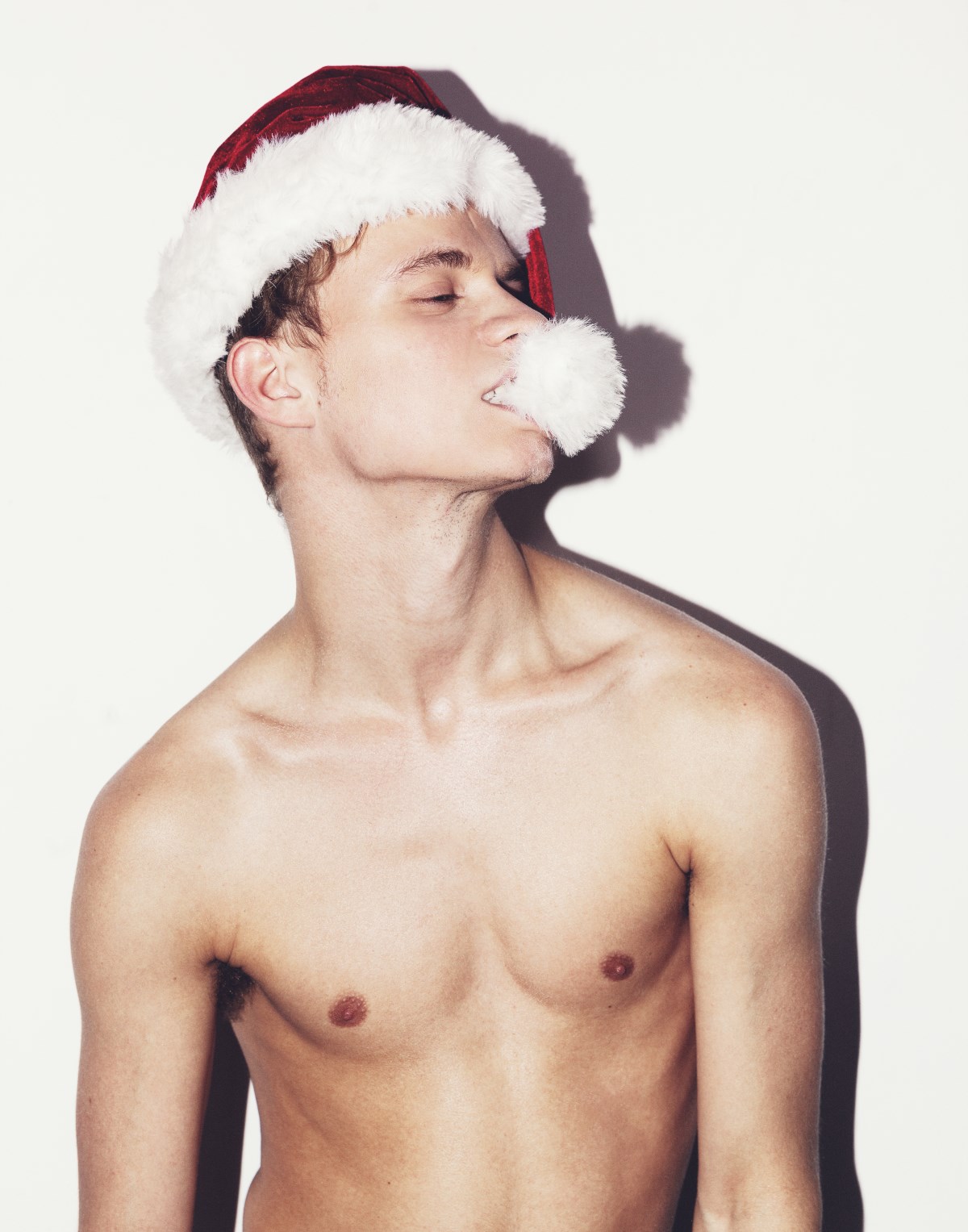 That design comes from Clashist, and aside from a Santa hat and a pair of Calvin Klein briefs, you won’t see George wearing much else in this shoot by Mitch Zachary. I’m pretty into the shots where he’s letting his bare ass hang out in his sweater, because well, I’m equally fond of wearing stylish tops with no bottoms.