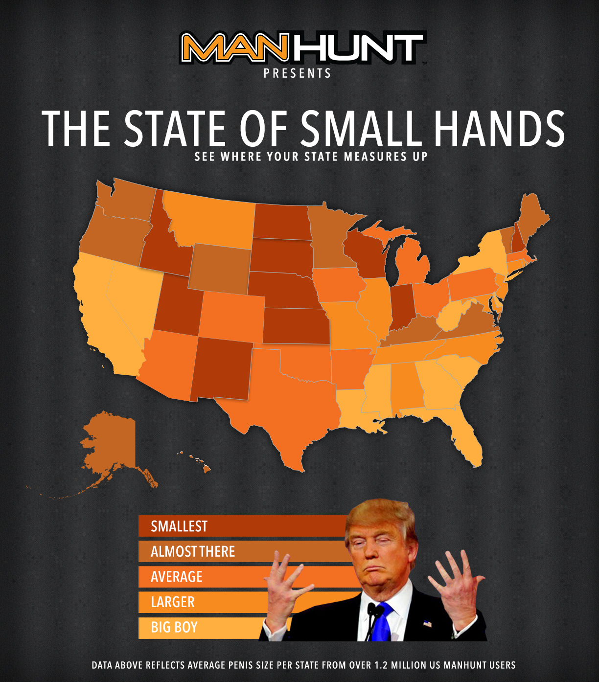 We all know the correlation people make between small hands and small “manhoods” – in fact, it was a correlation that was repeatedly made during the Republican primaries. Sadly, it would have probably been made during the Presidential race if Hillary had an actual penis. Well if the one correlation is anecdotally true, then one could assume that the opposite is also true. The folks at Manhunt mined their data from over 1.7million US members (no pun intended) and are proud to present the states with the smallest hands.